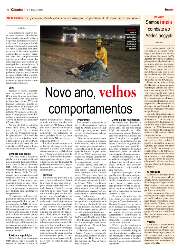 Santistas e turistas encontraram, na manhã de quarta-feira (1º), a faixa de areia, os jardins e a orla prontos para mais um dia de lazer. Isso porque, 559 trabalhadores realizaram mutirão de limpeza durante a madrugada no primeiro dia de 2025. Foram re- colhidas 90 toneladas de lixo durante a megaoperação deste Réveillon, registrando um aumento de 34% em relação ao ano anterior