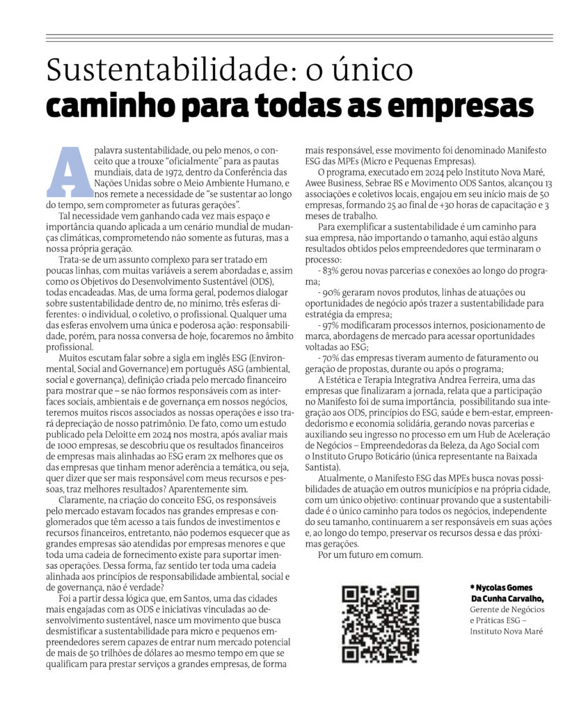 Foi a partir dessa lógica que, em Santos, uma das cidades mais engajadas com as ODS e iniciativas vinculadas ao desenvolvimento sustentável, nasce um movimento que busca desmistificar a sustentabilidade para micro e pequenos empreendedores serem capazes de entrar num mercado potencial de mais de 50 trilhões de dólares ao mesmo tempo em que se qualificam para prestar serviços a grandes empresas, de forma mais responsável, esse movimento foi denominado Manifesto ESG das MPEs (Micro e Pequenas Empresas).