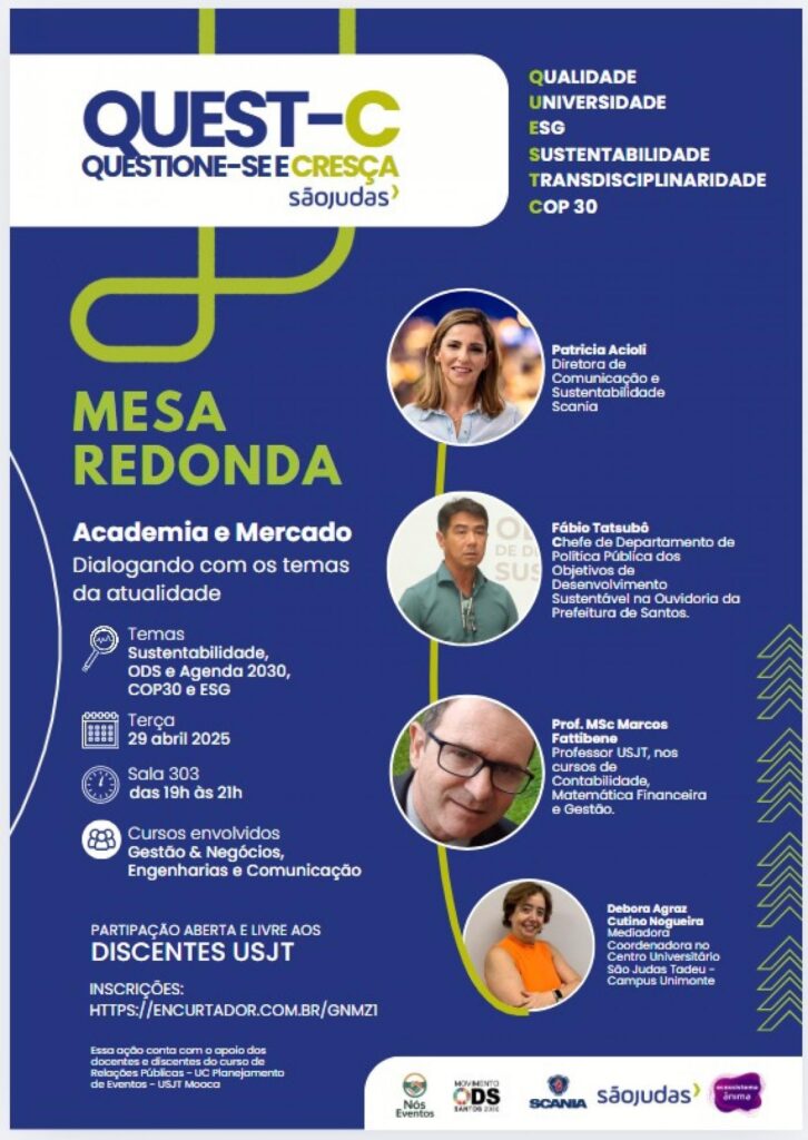 Também participarão da mesa Patricia Acioli, diretora de Comunicação e Sustentabilidade da Scania, e Marcos Fattibene, docente da São Judas, sob mediação da professora Débora Agraz. O evento é destinado aos discentes dos cursos de Gestão & Negócios, Engenharias e Comunicação da instituição.