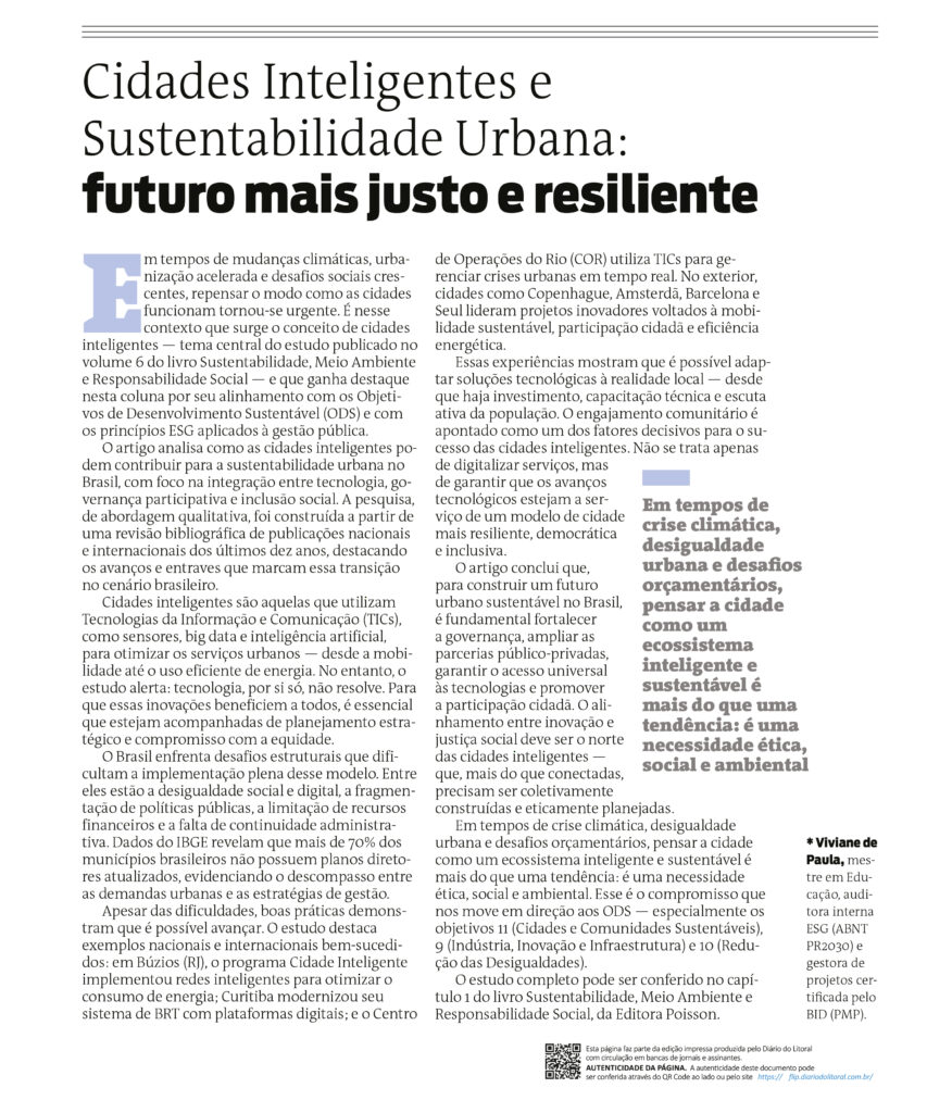 Em tempos de mudanças climáticas, urbanização acelerada e desafios sociais crescentes, repensar o modo como as cidades funcionam tornou-se urgente. É nesse contexto que surge o conceito de cidades inteligentes — tema central do estudo publicado no volume 6 do livro Sustentabilidade, Meio Ambiente e Responsabilidade Social — e que ganha destaque nesta coluna por seu alinhamento com os Objetivos de Desenvolvimento Sustentável (ODS) e com os princípios ESG aplicados à gestão pública.