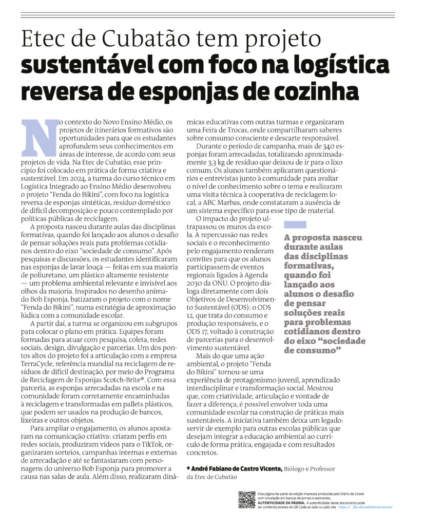 No contexto do Novo Ensino Médio, os projetos de itinerários formativos são oportunidades para que os estudantes aprofundem seus conhecimentos em áreas de interesse, de acordo com seus projetos de vida. Na Etec de Cubatão, esse princípio foi colocado em prática de forma criativa e sustentável. Em 2024, a turma do curso técnico em Logística Integrado ao Ensino Médio desenvolveu o projeto “Fenda do Bikini”, com foco na logística reversa de esponjas sintéticas, resíduo doméstico de difícil decomposição e pouco contemplado por políticas públicas de reciclagem.