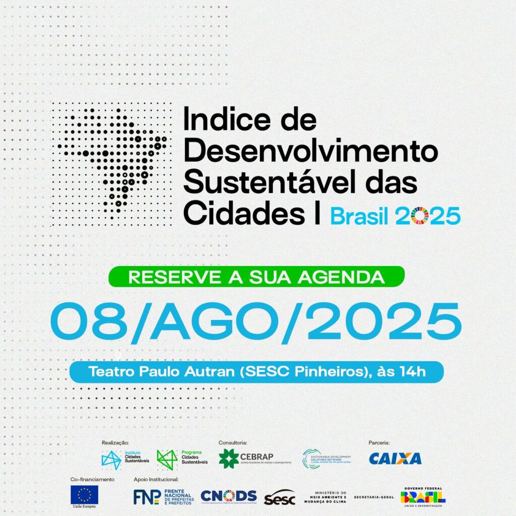 O lançamento oficial do IDSC-BR 2025 (Índice de Desenvolvimento Sustentável das Cidades – Brasil) já tem data marcada: será realizado no dia 8 de agosto, às 14h, em formato híbrido, com evento presencial no Sesc Pinheiros e transmissão ao vivo pelo YouTube.