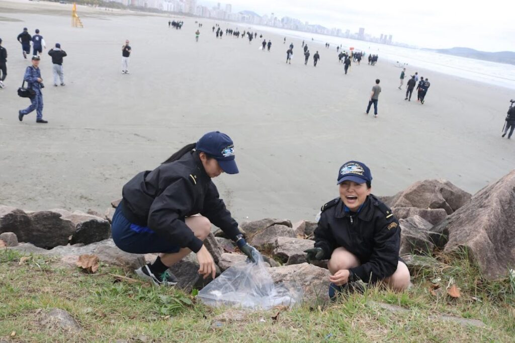 Integrantes de uma esquadra de treinamento da Marinha japonesa, acompanhados da Marinha do Brasil, da Polícia Militar, do Instituto Mar Azul (IMA) e Secretaria de Meio Ambiente e Desenvolvimento Urbano e Sustentabilidade (Semam) participaram de um mutirão de limpeza na faixa de areia da praia em Santos, na manhã desta segunda-feira (25).