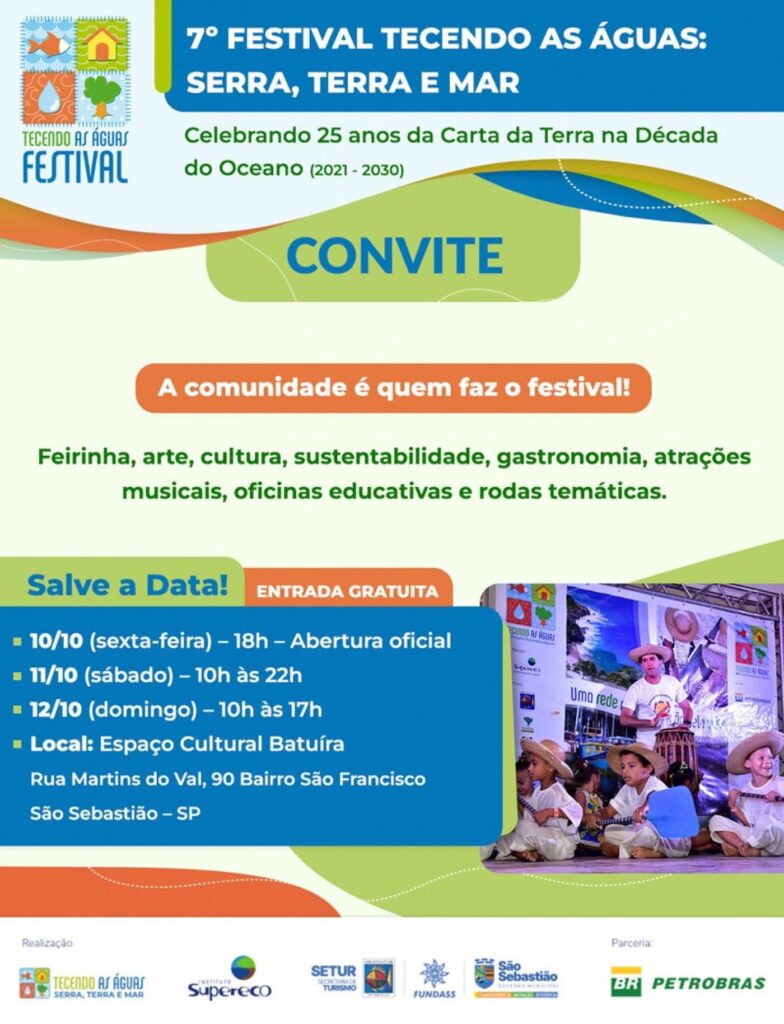 A 7ª edição do Festival Tecendo as Águas: serra, terra e mar, promovido pelo Instituto Supereco, começa nesta sexta-feira (10), em São Sebastião. Na abertura, haverá apresentação do Movimento ODS Santos no formato de roda de conversa.