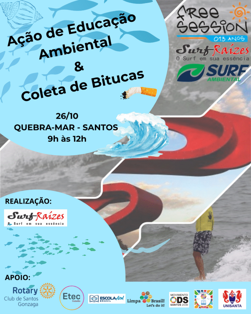 No próximo domingo, 26 de outubro, das 9h às 12h, o Quebra-Mar de Santos será palco de uma importante ação de conscientização ambiental. O Projeto Surf Raízes, em parceria com estudantes da Universidade Santa Cecília (UNISANTA) e com apoio da Etec de Cubatão, realizará uma atividade educativa com foco na coleta de bitucas de cigarro e na sensibilização sobre os impactos dos resíduos sólidos nos ecossistemas costeiros.