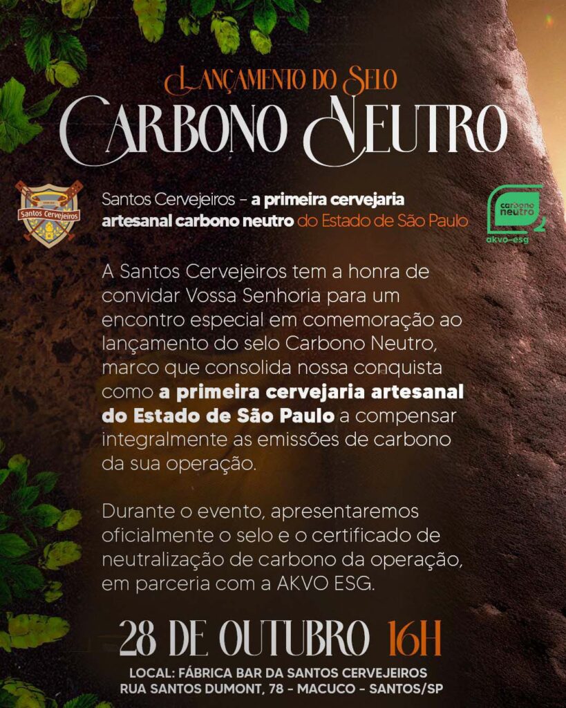 Amanhã, terça, 28/10, às 16h, a cervejaria artesanal Santos Cervejeiros, integrante da Rota da Cerveja Artesanal de Santos, realiza o lançamento oficial do Selo Carbono Neutro — tornando-se a primeira cervejaria artesanal do Estado de São Paulo a neutralizar integralmente suas emissões de carbono.