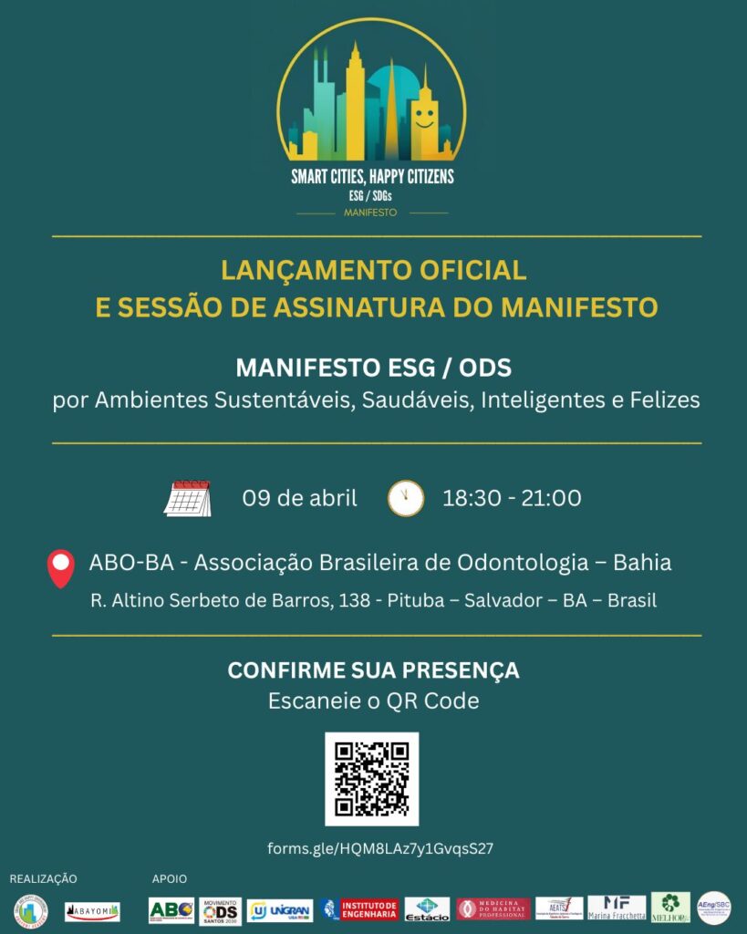 A Abayomi Academy e a ABO-BA (Associação Brasileira de Odontologia – Bahia) têm a honra de convidar você para o evento de lançamento oficial do Manifesto ESG / ODS, que acontecerá em Salvador.