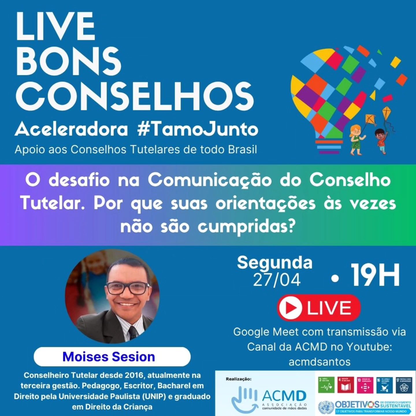 No próximo dia 27 de abril de 2026 (segunda-feira), às 19h, a Associação Comunidade de Mãos Dadas (ACMD) realiza mais uma edição da série Bons Conselhos – Aceleradora #tamojunto, com transmissão pelo YouTube da ACMD e pelo Google Meet.