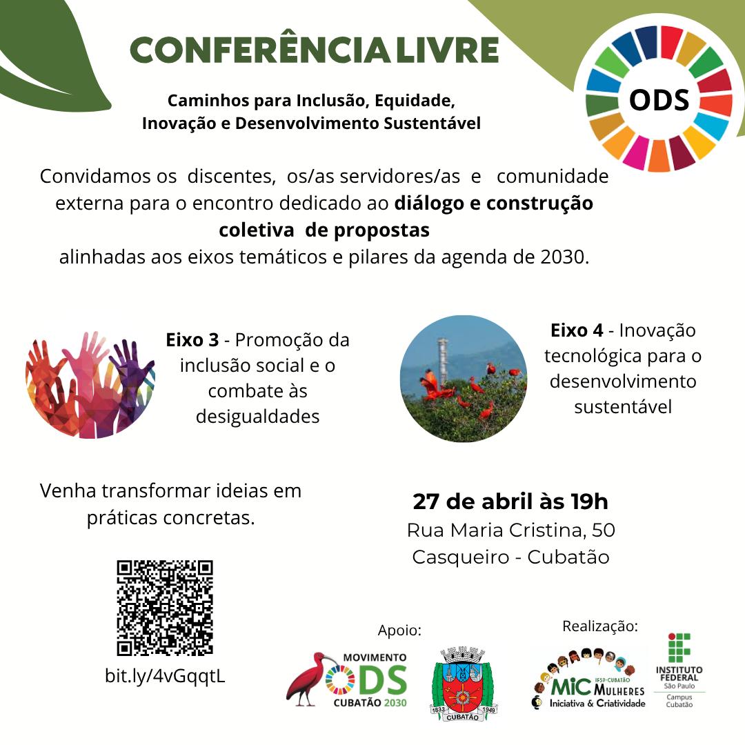 O Instituto Federal de Cubatão realiza, em breve, a Conferência Livre – Caminhos para Inclusão, Equidade, Inovação e Desenvolvimento Sustentável, um espaço de mobilização social, diálogo intersetorial e construção coletiva de propostas. A iniciativa integra os debates da 1ª Conferência Nacional dos Objetivos de Desenvolvimento Sustentável (ODS) e fortalece os esforços locais para o avanço da Agenda 2030.
